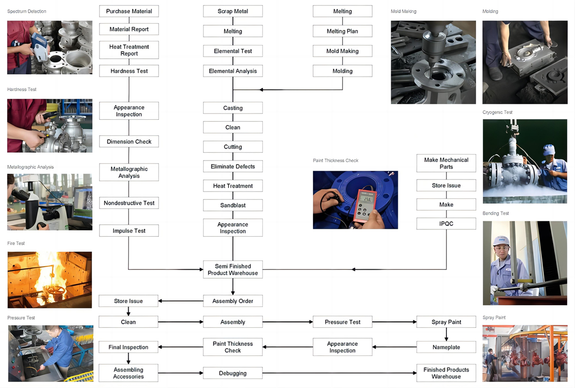 Raw Material Checking, Chemical Analysis, Mechanical Test, Visual Inspection, Dimension Check, Bend Test , Flattening Test, Impact Test, DWT Test, Non-Destructive Examination, Hardness Test, Pressure Testing, Seat Leakage Testing, Flow Performance Testing, Torque and Thrust Testing, Painting and Coating Inspection, Documentation Review…..
