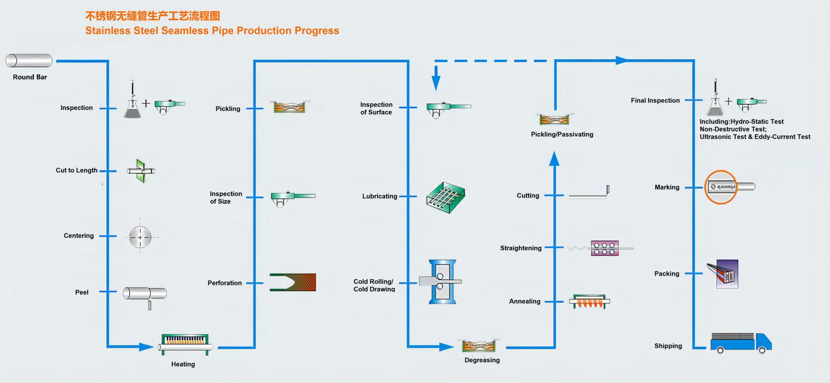 Round tube billet→heating→perforation→heading→annealing→pickling→oiling (copper plating)→multi-pass cold drawing (cold rolling)→billet→heat treatment→straightening→Hydraulic test (flaw detection)→Marking→Storage.