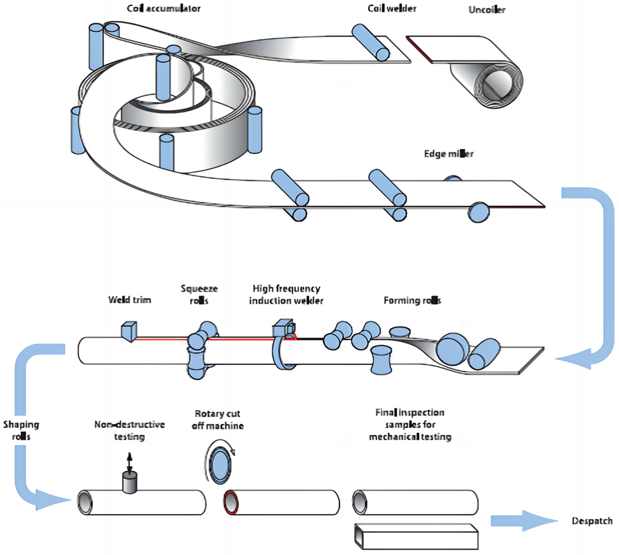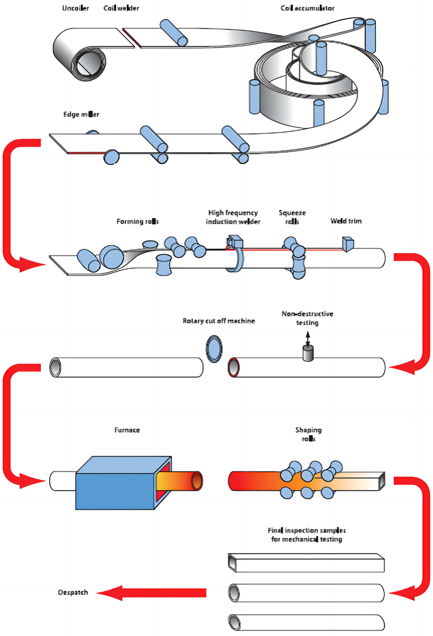 Rectangular/ Square hollow section are formed from the coils and then ran through a series of dies. They are are welded from the inside to form their shape.